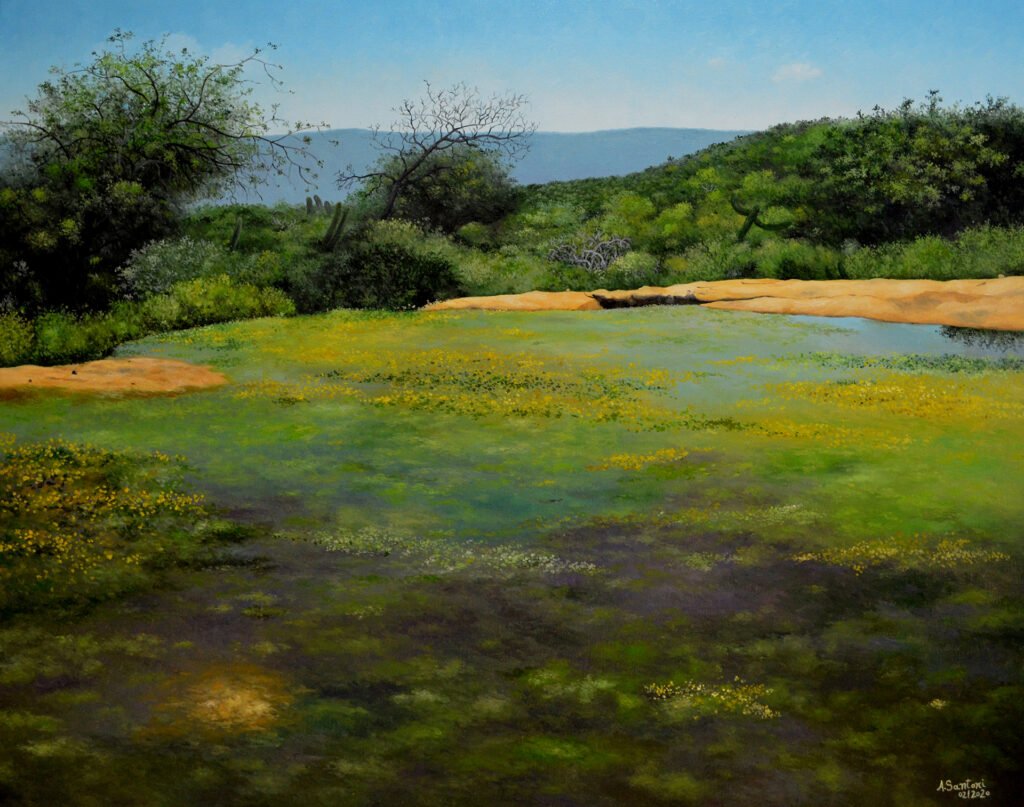 Esta obra nasceu de uma expedição fotográfica que fiz com um grupo de amigos ao Sítio Jatobá, em Acari. Depois de algumas caminhadas chegamos a este local que os moradores denominam como “O Tanque”. Achei a foto muito bonita parecendo com uma pintura de Monet e suas paisagens de água.